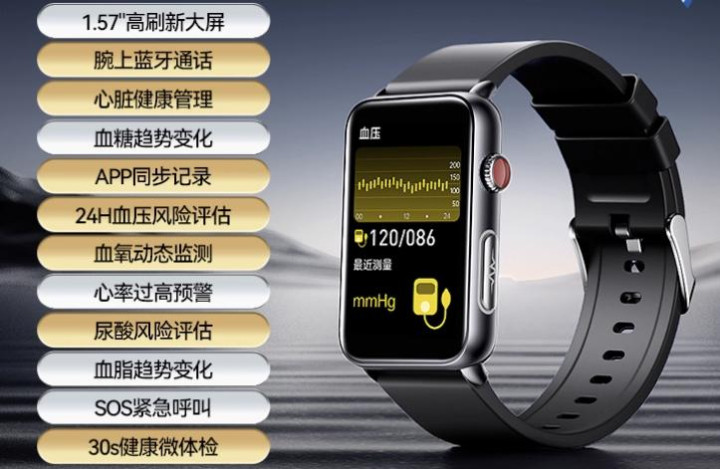核心优势 :30秒快速评估多项健康指标,24小时自动监测血压、血糖、尿酸,支持一键SOS呼叫。