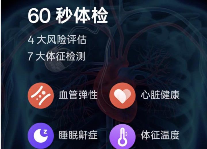 60秒全身检测功能,一次性生成心率、血氧、压力等6项指标报告。